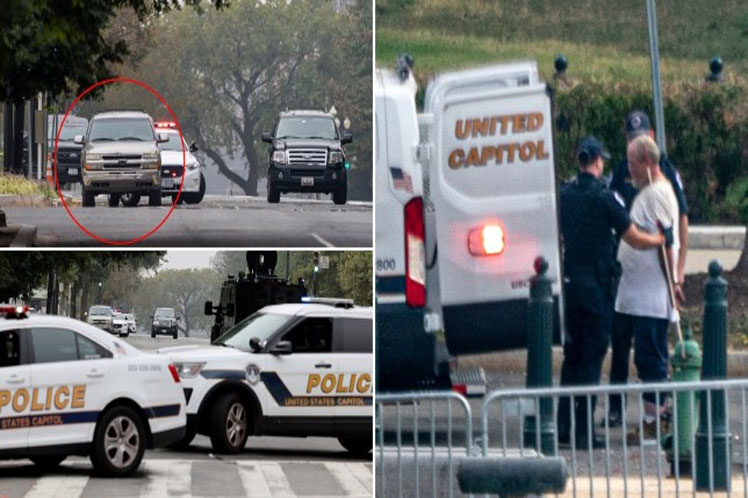 ‘One of our teams just moved in and extracted the man from the SUV. The man is in custody. Everyone is safe,’ the Capitol Police said in a statement.