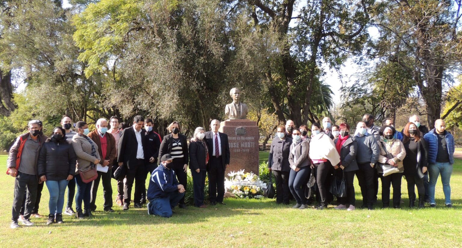 Members of the Argentine Movement of Solidarity (MasCuba), the Network of Martian Chairs, the Union of Cuban Residents (URCA), the Association of Graduates on the island and the diplomatic mission of the largest of the Antilles placed a floral offering before the bust of the Cuban patriot in the Garden of the poets of Paseo del Rosedal.