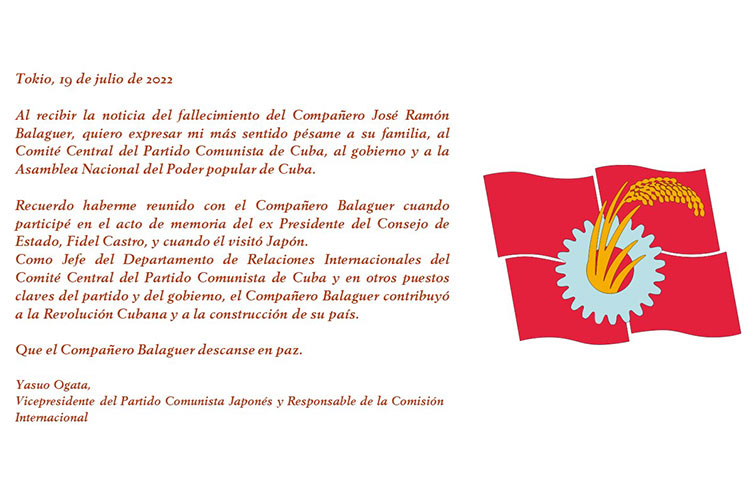 “I wish to express my deepest condolences to the family, the Central Committee of the Communist Party of Cuba (PCC), the Government and the National Assembly of People’s Power,” reads the letter sent by Yasuo Ogata, JCP Vice President and Chairperson of the International Commission.