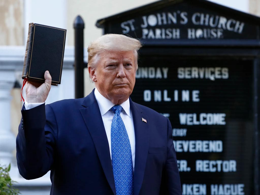 When he was president, law enforcement officers aggressively removed racial justice protesters from a park near the White House, allowing Trump to walk to nearby St. John’s Church, where he stood alone and raised a Bible. The scene was condemned at the time by the bishop of the Episcopal Diocese of Washington.