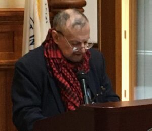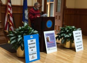 Prominent pacifist leader Henry Lowendorf expresses MLK’s views on capitalism and social inequality and denounces crimes against immigrants and the Palestinian people. Photo by the author