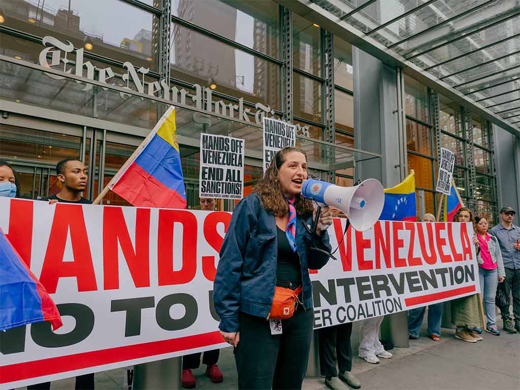 New York City Residents gathered last night in front of the headquarters of The New York Times chanting “No to US intervention,” accusing the newspaper of being involved “in a disinformation campaign to encourage and justify attempts of coup d’état and economic war led by the United States against Venezuela.