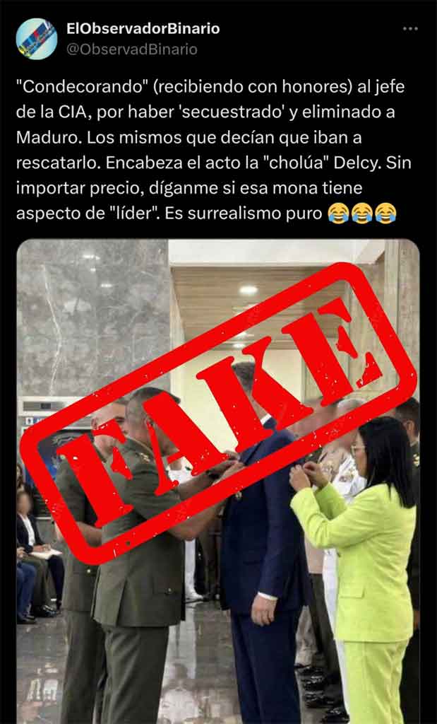 “We categorically deny the malicious information circulating on social media about an alleged decoration with honors for foreign intelligence agencies,” wrote the account @AlMomento_M (Miraflores al Momento).