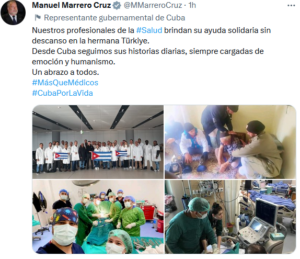 Havana, Feb 21 (Prensa Latina) Prime Minister Manuel Marrero on Tuesday acknowledged the work by Cuban healthcare professionals who are collaborating with the people affected by the earthquakes that hit Türkiye recently.